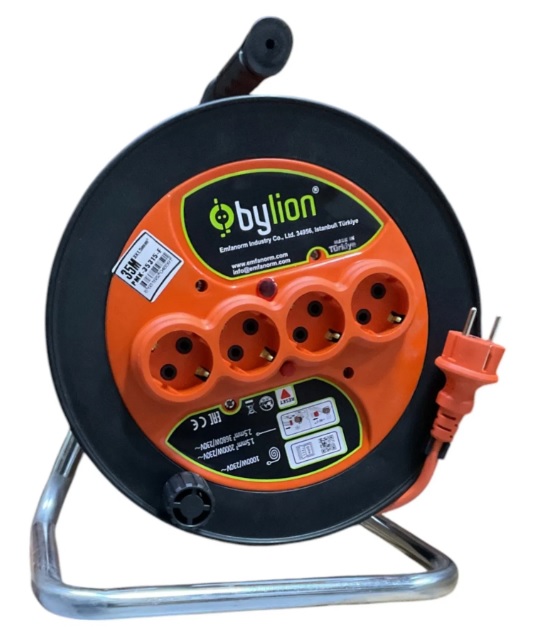Bylion markasının PMK-50325-F model seyyar kablo makarası, 4 adet priz ve 50 metrelik TTR kabloya sahiptir.