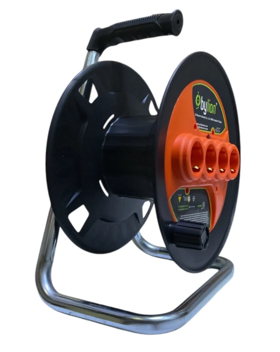 - Bylion PMP-10000-F modeli, 4 adet standart güvenli ve kapaklı kontak prizli ve 50 metre kapasiteli kablosuz plastik kablo makarasıdır.