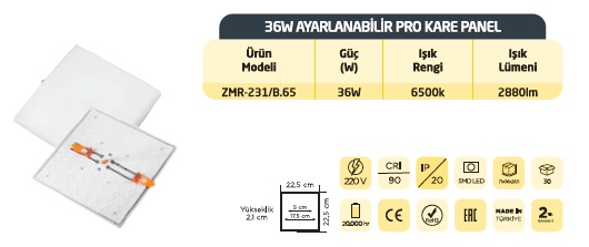 ZMR 36W 6500K beyaz ışık AYARLANABİLİR SIVA ALTI KARE LED ARMATÜR