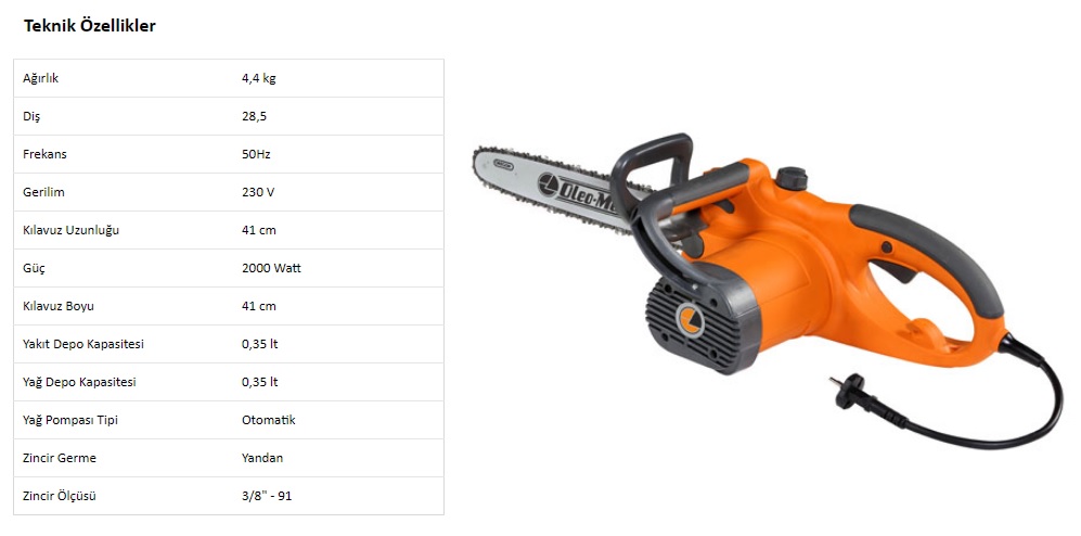Ortalama 3 (üç) iş günü.Oleomac GS 200 E Elektrikli Testere