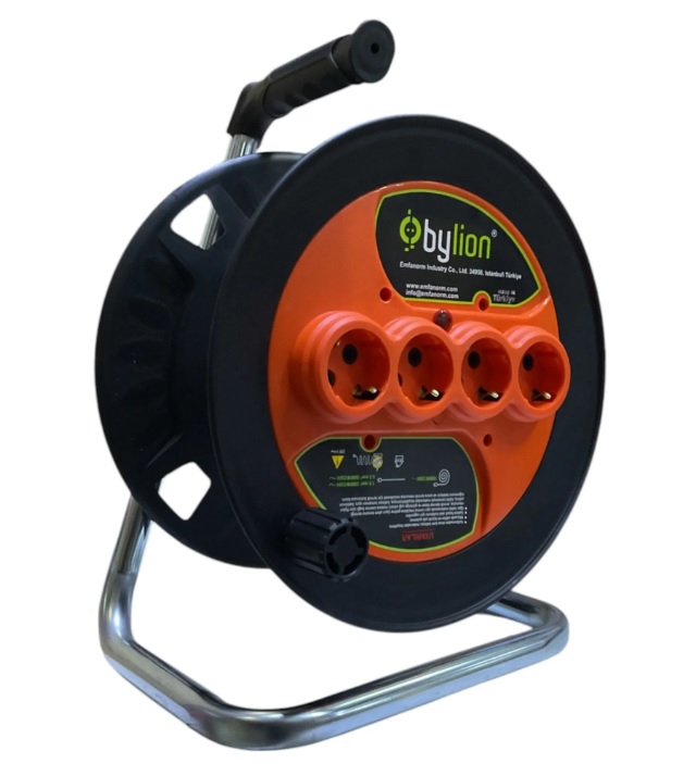 Bylion markasının PMK-35315-F model seyyar kablo makarası, 4 adet priz ve 35 metrelik TTR kabloya sahiptir.