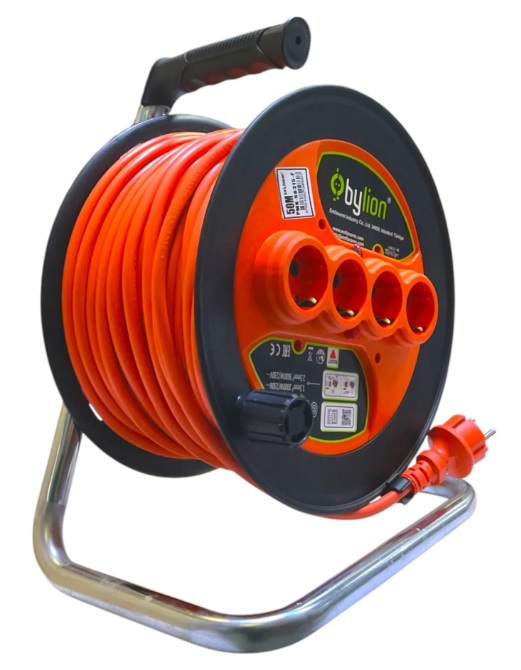 Bylion markasının PMK-50325-F model seyyar kablo makarası, 4 adet priz ve 50 metrelik TTR kabloya sahiptir.