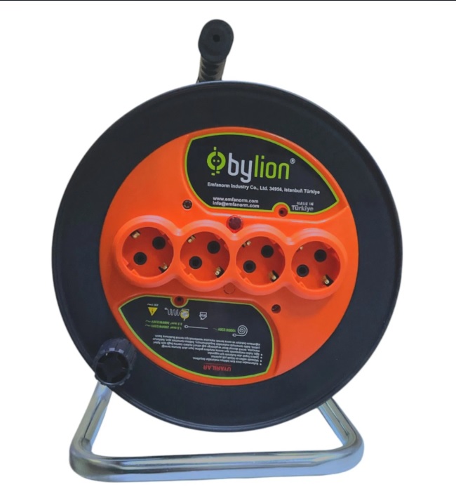 - Bylion PMP-10000-F modeli, 4 adet standart güvenli ve kapaklı kontak prizli ve 50 metre kapasiteli kablosuz plastik kablo makarasıdır.